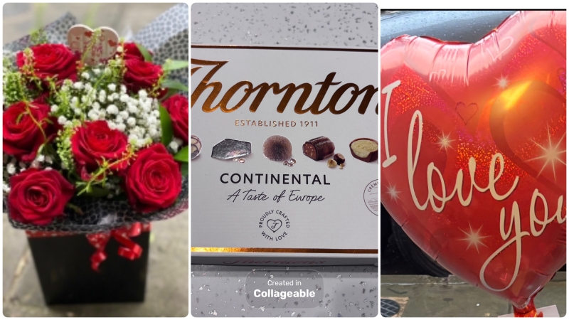 Valentine gift set comprising of 12 red roses, chocolates and balloon